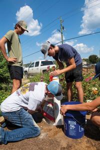 Cliff Williams / TPI Rutledge Rogers, left, supervises the installation of a sleeve that will hold a flag pole.