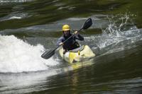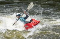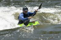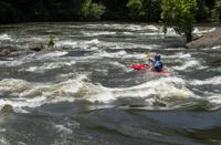 Cliff Williams / The Herald A kayaker surfs the lower drop in Moccasin Gap on the Coosa River. The unofficial Coosa River Whitewater Festival featured paddle boarders and kayakers in a friendly competition. It is the first time since the COVID-19 pandemic organizers have organized the event.