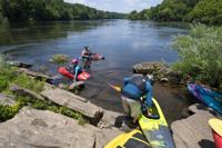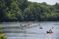 Cliff Williams / The Herald Recreational kayakers approach Moccasin Gap on the Coosa River. The unofficial Coosa River Whitewater Festival featured paddle boarders and kayakers in a friendly competition. It is the first time since the COVID-19 pandemic organizers have organized the event.