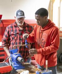 Cliff Williams / TPI Elmore County Technical Center plumbing instructor James Broadway shows students how to connect copper pipe using a solider iron in the shop. He has students complete an art type piece in the class to demonstrate skills cutting and connecting the pipe.