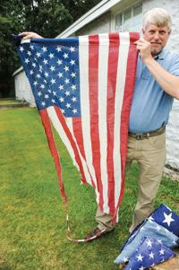 Gardner Perdue holds up an example of a tattered American flag that will be properly disposed of during a Flag Day ceremony in Wetumpka on June 14.