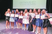 Elmore County Distinguished Young Women scholarship award winners were, from left, Tallassee High’s Taylor Goodman (fitness), Tallassee High’s Orliyah Poole (Roberta Pilcher Spirit Award), Tallassee High’s Sally Shipman (scholastic), Elmore County High’s Rhianna Lumpkin (scholastic, talent, first runner-up), Holtville High’s Blakley White (winner, interview, fitness, self-expression), 2019 Elmore County DYW winner Mary Fran Healey, Montgomery Academy’s Virginia Puckett (interview, talent, second runner-up), Elmore County High’s Kaitlyn Pack (Be Your Best Self) and Holtville High’s Kennedy Mullis (self-expression).
