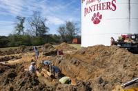Cliff Williams / TPI Town of Eclectic crews are joined by private contractors to repair a leaking water main Thursday. The nearby water tank has been out of operation for at least 10 years.