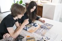 Cliff Williams / TPI Conner Eifert, left, and Audrey Jassco helped children’s art campers at The Kelly. Here they are trying to finish up the Great Wave set from LEGO that recreates the painting by Japanese artist Katsushika Hokusai.