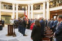 Cliff Williams / TPI Elmore County District Court Judge Glen Goggans gives the invocation at the investiture of Bill Lewis.