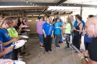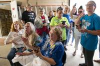 Cliff Williams / TPI Volunteers including Rea Cord, right, react to the last fundraising challenge of the day. Raise $1,000 in five minutes or get their heads shaved.