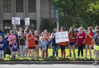 Cliff Williams / The Herald Parents and players of the Wetumpka Youth Baseball and Softball League gathered outside of the Wetumpka City Hall as discussions about the city’s lockout of fields was under way Sunday.