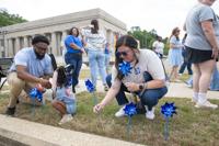 Cliff Williams / TPI Stacy Reed, right, installs a pinwheel on the lawn of the Elmore County Courthouse. Reed is the director of the Elmore County DHR.