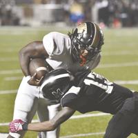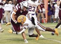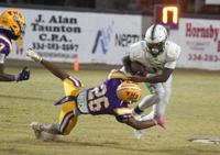 Lizi Arbogast Gwin / TPI Holtville's Daishaun Zeigler, right, tries to evade the tackle of Tallassee defender Tramel McCoy on Friday night.