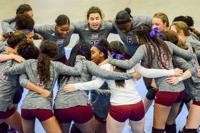 Caleb Turrentine / The Herald Stanhope Elmore players circle around Kaleiah Hollis prior to Friday's match at super regionals.