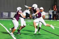 A pair of Elmore County defenders team up to take down the Valley running back on Friday night.