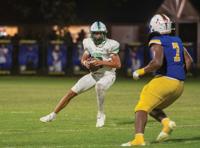 Ana Sofia Meyer / TPI Holtville quarterback Jacob Burgess (10) stares down Beauregard defensive lineman (7) as he scrambles to pick up yards in Opelika.