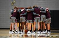 The Elmore County basketball team huddles at an AHSAA basketball game between the Stanhope Elmore Mustangs and the Elmore County Panthers at Stanhope Elmore High School in Millbrook, Alabama on Thursday, Dec. 2, 2021. [Jake Arthur/ Tallapoosa Publishers]