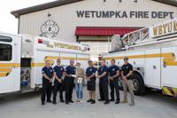 Cliff Williams / TPI Firefighters with the Wetumpka Fire Department pose with Joy to Life representative Joy Blondheim as the firefighters donate the proceeds from a T-shirt for breast cancer awareness to the organization.